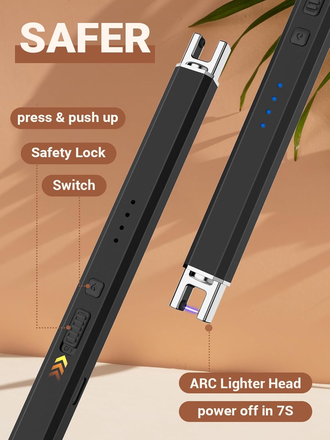 [Easy to Use & Easy to Carry] The humanized non-slip safety switch design ensures your family’s safety compared to other styles on the market. PUSH UP safety lock & PRESS switch then arc lighters working right away. Pocket-sized, thin and light body for portable, rechargeable candle lighter is an elegant super-handy tool for your daily indoor & outdoor use. Very perfect for home, office, bedroom, bathroom, kitchen, grill, fireplace, fireworks, party, spa, traveling, cooking, camping, hiking, BBQ